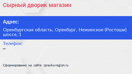 Сырный дворик, магазин по адресу Оренбургская область, Оренбург, Нежинское (Ростоши) шоссе, 1 в дальнейшем Организация, размещена в следующих категориях: