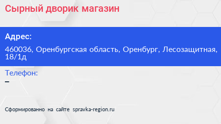 Сырный дворик, магазин по адресу 460036, Оренбургская область, Оренбург, Лесозащитная, 18/1д в дальнейшем Организация, размещена в следующих категориях: