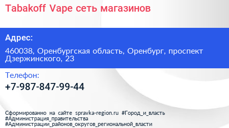 Tabakoff & Vape, сеть магазинов по адресу 460038, Оренбургская область, Оренбург, проспект Дзержинского, 23 в дальнейшем Организация, размещена в следующих категориях:
