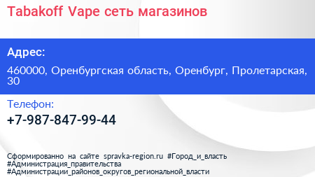 Tabakoff & Vape, сеть магазинов по адресу 460000, Оренбургская область, Оренбург, Пролетарская, 30 в дальнейшем Организация, размещена в следующих категориях: