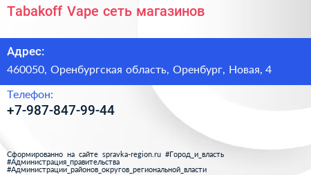 Tabakoff & Vape, сеть магазинов по адресу 460050, Оренбургская область, Оренбург, Новая, 4 в дальнейшем Организация, размещена в следующих категориях: