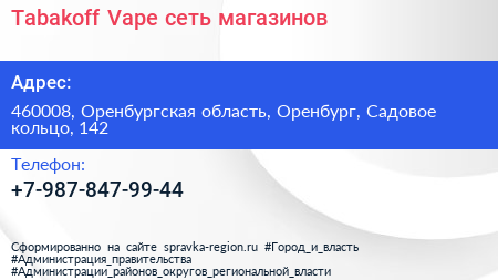 Tabakoff & Vape, сеть магазинов по адресу 460008, Оренбургская область, Оренбург, Садовое кольцо, 142 в дальнейшем Организация, размещена в следующих категориях:
