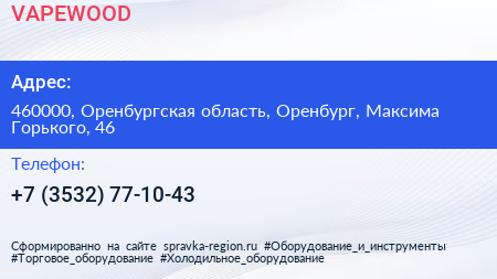 VAPEWOOD по адресу 460000, Оренбургская область, Оренбург, Максима Горького, 46 в дальнейшем Организация, размещена в следующих категориях: