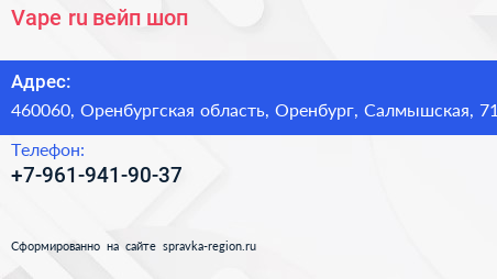 Vape.ru, вейп-шоп по адресу 460060, Оренбургская область, Оренбург, Салмышская, 71 в дальнейшем Организация, размещена в следующих категориях: