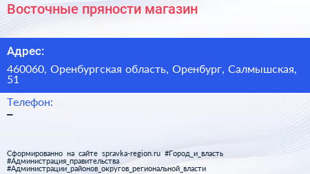 Восточные пряности, магазин по адресу 460060, Оренбургская область, Оренбург, Салмышская, 51 в дальнейшем Организация, размещена в следующих категориях: