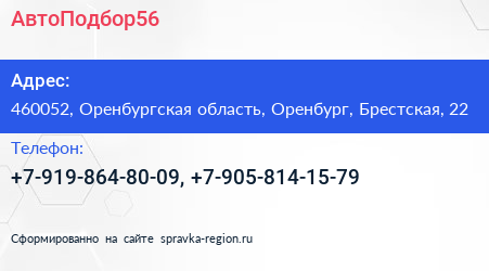 АвтоПодбор56 по адресу 460052, Оренбургская область, Оренбург, Брестская, 22 в дальнейшем Организация, размещена в следующих категориях: