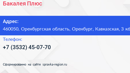Бакалея Плюс по адресу 460050, Оренбургская область, Оренбург, Кавказская, 3 к6 в дальнейшем Организация, размещена в следующих категориях: