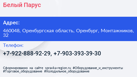 Белый Парус по адресу 460048, Оренбургская область, Оренбург, Монтажников, 32 в дальнейшем Организация, размещена в следующих категориях: