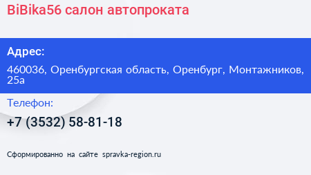BiBika56, салон автопроката по адресу 460036, Оренбургская область, Оренбург, Монтажников, 25а в дальнейшем Организация, размещена в следующих категориях: