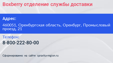 Boxberry, отделение службы доставки по адресу 460051, Оренбургская область, Оренбург, Промысловый проезд, 21 в дальнейшем Организация, размещена в следующих категориях: