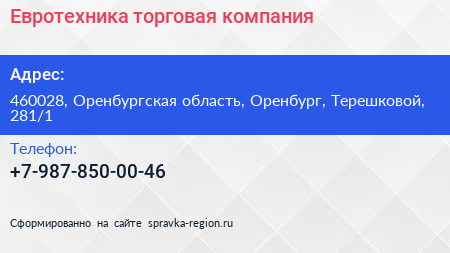 Евротехника, торговая компания по адресу 460028, Оренбургская область, Оренбург, Терешковой, 281/1 в дальнейшем Организация, размещена в следующих категориях: