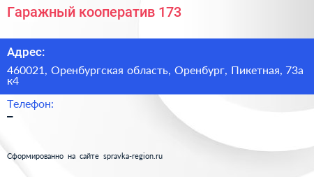 Гаражный кооператив №173 по адресу 460021, Оренбургская область, Оренбург, Пикетная, 73а к4 в дальнейшем Организация, размещена в следующих категориях:
