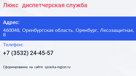 Люкс+, диспетчерская служба по адресу 460048, Оренбургская область, Оренбург, Лесозащитная, 8 в дальнейшем Организация, размещена в следующих категориях: