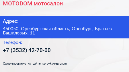 MOTODOM, мотосалон по адресу 460050, Оренбургская область, Оренбург, Братьев Башиловых, 11 в дальнейшем Организация, размещена в следующих категориях: