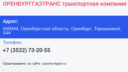ОРЕНБУРГГАЗТРАНС, транспортная компания по адресу 460044, Оренбургская область, Оренбург, Терешковой, 144 в дальнейшем Организация, размещена в следующих категориях: