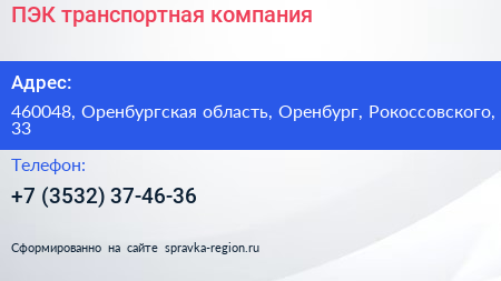ПЭК, транспортная компания по адресу 460048, Оренбургская область, Оренбург, Рокоссовского, 33 в дальнейшем Организация, размещена в следующих категориях: