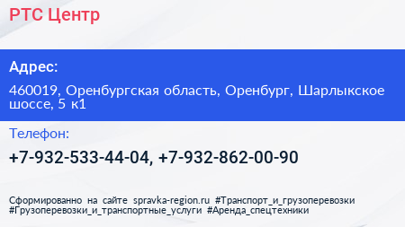 РТС-Центр по адресу 460019, Оренбургская область, Оренбург, Шарлыкское шоссе, 5 к1 в дальнейшем Организация, размещена в следующих категориях: