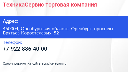 ТехникаСервис, торговая компания по адресу 460004, Оренбургская область, Оренбург, проспект Братьев Коростелёвых, 52 в дальнейшем Организация, размещена в следующих категориях: