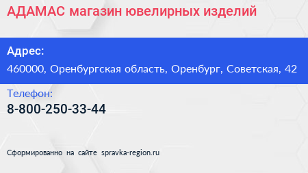 АДАМАС, магазин ювелирных изделий по адресу 460000, Оренбургская область, Оренбург, Советская, 42 в дальнейшем Организация, размещена в следующих категориях: