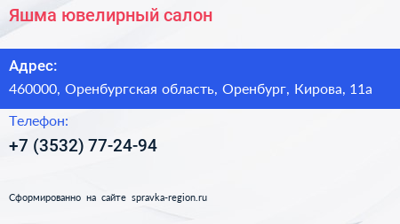 Яшма, ювелирный салон по адресу 460000, Оренбургская область, Оренбург, Кирова, 11а в дальнейшем Организация, размещена в следующих категориях: