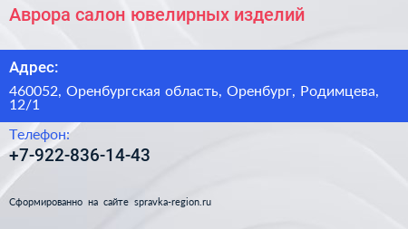 Аврора, салон ювелирных изделий по адресу 460052, Оренбургская область, Оренбург, Родимцева, 12/1 в дальнейшем Организация, размещена в следующих категориях: