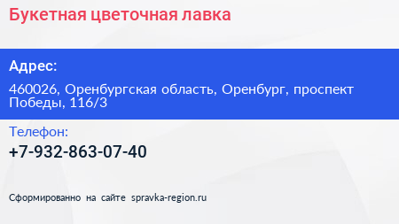 Букетная, цветочная лавка по адресу 460026, Оренбургская область, Оренбург, проспект Победы, 116/3 в дальнейшем Организация, размещена в следующих категориях: