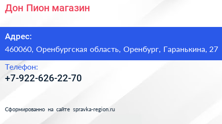 Дон Пион, магазин по адресу 460060, Оренбургская область, Оренбург, Гаранькина, 27 в дальнейшем Организация, размещена в следующих категориях: