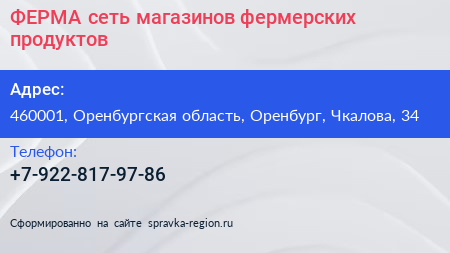 ФЕРМА, сеть магазинов фермерских продуктов по адресу 460001, Оренбургская область, Оренбург, Чкалова, 34 в дальнейшем Организация, размещена в следующих категориях: