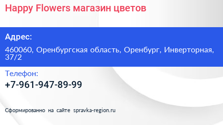 Happy Flowers, магазин цветов по адресу 460060, Оренбургская область, Оренбург, Инверторная, 37/2 в дальнейшем Организация, размещена в следующих категориях: