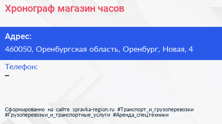Хронограф, магазин часов по адресу 460050, Оренбургская область, Оренбург, Новая, 4 в дальнейшем Организация, размещена в следующих категориях: