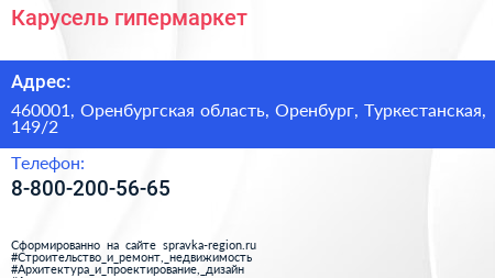 Карусель, гипермаркет по адресу 460001, Оренбургская область, Оренбург, Туркестанская, 149/2 в дальнейшем Организация, размещена в следующих категориях: