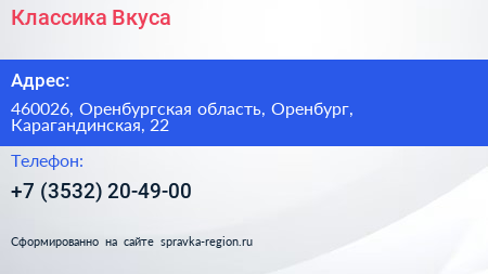 Классика Вкуса по адресу 460026, Оренбургская область, Оренбург, Карагандинская, 22 в дальнейшем Организация, размещена в следующих категориях: