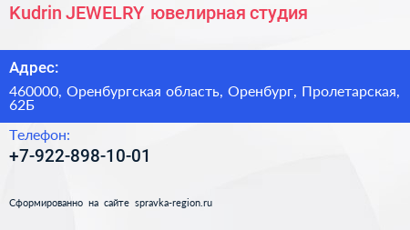 Kudrin JEWELRY, ювелирная студия по адресу 460000, Оренбургская область, Оренбург, Пролетарская, 62Б в дальнейшем Организация, размещена в следующих категориях: