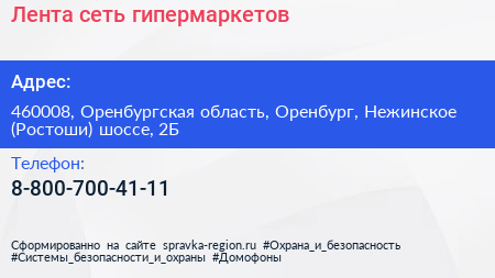 Лента, сеть гипермаркетов по адресу 460008, Оренбургская область, Оренбург, Нежинское (Ростоши) шоссе, 2Б в дальнейшем Организация, размещена в следующих категориях: