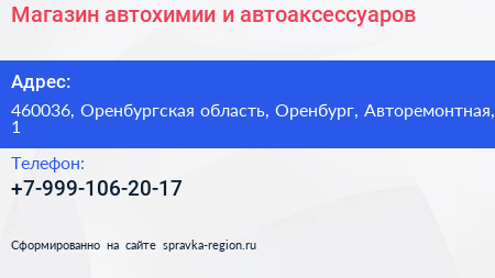 Магазин автохимии и автоаксессуаров по адресу 460036, Оренбургская область, Оренбург, Авторемонтная, 1 в дальнейшем Организация, размещена в следующих категориях: