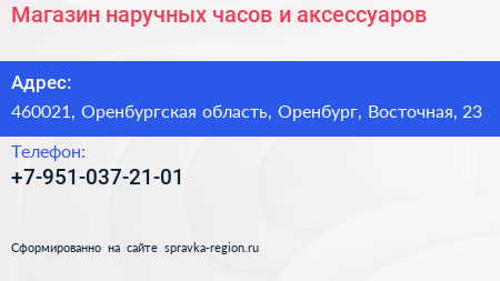 Магазин наручных часов и аксессуаров по адресу 460021, Оренбургская область, Оренбург, Восточная, 23 в дальнейшем Организация, размещена в следующих категориях:
