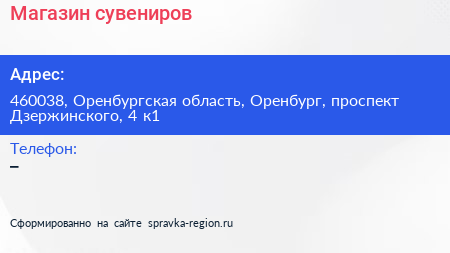 Магазин сувениров по адресу 460038, Оренбургская область, Оренбург, проспект Дзержинского, 4 к1 в дальнейшем Организация, размещена в следующих категориях: