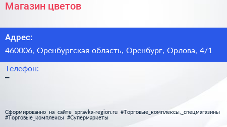 Магазин цветов по адресу 460006, Оренбургская область, Оренбург, Орлова, 4/1 в дальнейшем Организация, размещена в следующих категориях: