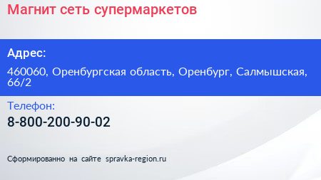 Магнит, сеть супермаркетов по адресу 460060, Оренбургская область, Оренбург, Салмышская, 66/2 в дальнейшем Организация, размещена в следующих категориях: