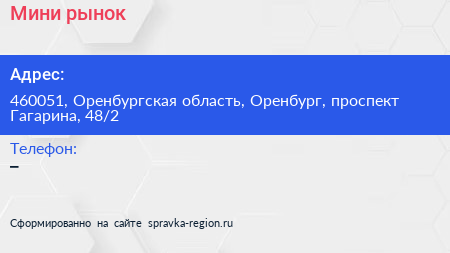 Мини-рынок по адресу 460051, Оренбургская область, Оренбург, проспект Гагарина, 48/2 в дальнейшем Организация, размещена в следующих категориях: