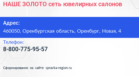 НАШЕ ЗОЛОТО, сеть ювелирных салонов по адресу 460050, Оренбургская область, Оренбург, Новая, 4 в дальнейшем Организация, размещена в следующих категориях: