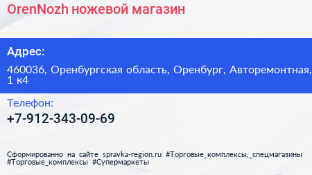 OrenNozh, ножевой магазин по адресу 460036, Оренбургская область, Оренбург, Авторемонтная, 1 к4 в дальнейшем Организация, размещена в следующих категориях: