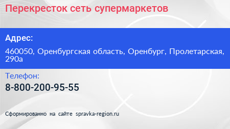 Перекресток, сеть супермаркетов по адресу 460050, Оренбургская область, Оренбург, Пролетарская, 290а в дальнейшем Организация, размещена в следующих категориях: