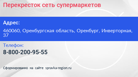 Перекресток, сеть супермаркетов по адресу 460060, Оренбургская область, Оренбург, Инверторная, 37 в дальнейшем Организация, размещена в следующих категориях: