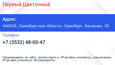Первый Цветочный по адресу 460018, Оренбургская область, Оренбург, Аксакова, 30 в дальнейшем Организация, размещена в следующих категориях: