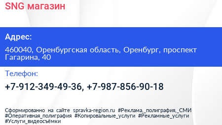 SNG, магазин по адресу 460040, Оренбургская область, Оренбург, проспект Гагарина, 40 в дальнейшем Организация, размещена в следующих категориях: