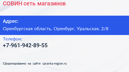 СОВИН, сеть магазинов по адресу Оренбургская область, Оренбург, Уральская, 2/8 в дальнейшем Организация, размещена в следующих категориях: