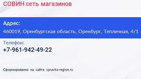 СОВИН, сеть магазинов по адресу 460019, Оренбургская область, Оренбург, Тепличная, 4/1 в дальнейшем Организация, размещена в следующих категориях: