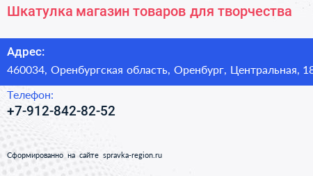 Шкатулка, магазин товаров для творчества по адресу 460034, Оренбургская область, Оренбург, Центральная, 18 в дальнейшем Организация, размещена в следующих категориях: