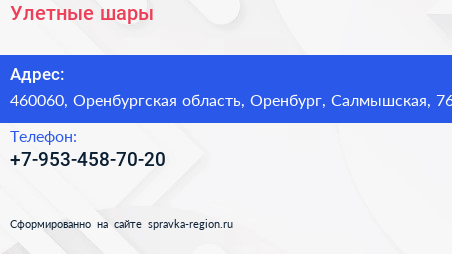 Улетные шары по адресу 460060, Оренбургская область, Оренбург, Салмышская, 76 в дальнейшем Организация, размещена в следующих категориях: